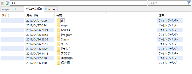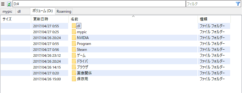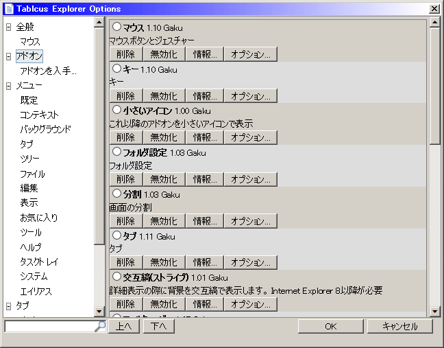 上の段、シンプルアドレスバー(ダウンロードアドオン)。 下の段、アドレスバー(標準搭載パンくずリスト)。 標準搭載のアドレスバーのオプションで「XPスタイル」にチェックが入っていると上の段のシンプルアドレスバー風になります。 XPスタイルチェック時のアドレスバーとシンプルアドレスバーとの違いは、左にフォルダアイコンが出るか出ないかとドロップダウンでフォルダを選択出来るかできないかです。 Tablacus ExplorerのちょっとしたTips・メニューの「ヘルプ(H)」の右に出てくる数字って何? マウスの何のボタンを押しているかの表示です。 ・ドラッグでファイル移動しようとすると数秒固まる。 移動中に、休止中のHDDのタブを通りませんでしたか? その上を通るとHDDが回り始めるため、数秒TEが動かなくなったりします。 ・標準で付いてる「フィルタバー」と、アドオンの「検索バー」って何が違うの? フィルタバーからの文字入力は、新しいリストを作らずシームレスに動き、検索文字を消すとリストが全て表示されます。 対して検索バーの方は新しいリストを作り、リセットされません。 ・アップデートって毎回圧縮ファイル落としてこないとダメなの? メニューの「ヘルプ→最新版の確認」をクリックすることで、半自動的にアップデートすることができます。 自動でアップデートを確認してくれないので、ツイッターをやっている人なら作者のGakuさん@tablacusをフォローしておけばバージョンアップがわかりやすいです。 ・ファイルの選択後のフォーカスアウト時に点線を出したい2016-01-16追加 何かのタイミング(アップデート後とか)でフォーカス時の枠(点線)が消える事がある。 「枠はカーソルで左右に移動できるので[←]を何度か押してみてください。」 アドオンやオプションを見直してもそれらしい項目がわからなかったので作者に聞いてみたところこんな答えが。いやはや盲点。 普段フォーカスをマウスでしか移動しない人には気づかない部分でした。 Tablacus Explorer への移行。※32bitから64bitに変更した人ダウンロードしてきたままのTEはちょっとだけXFよりも機能が少ない。 ある程度の機能は「アドオン」となり、自分でDLしてこないとXFよりも使い勝手が悪い。 32bitOSだと誑すに移行しなくてもXFで十分かも(WOW64がなくなるまで)。 ・ソフト(ソフトウェア)とアプリ(アプリケーション)という名称が混在していますが、基本的に実行ファイル(exe等)を指します。 アドオンをインストール・フォルダ設定(X-Finderのフォルダ設定と同じ。) ・クラシックスタイル(Windows自体でクラシックスタイルを使っていると不要。) ・IMEを自動的に無効にする(フォルダをabcで飛ぶ人なら必須。) ・交互縞(ストライプ)(ファイルリストをシマシマにしてくれる。) ・更新日時の変更 ・小さいアイコン(アイコンが大きかったらこれを使うと小さくなる、順序を上に持ってこないと適応されない。) ![]() わかりにくいアドオン・その1(マルチスレッド、マルチタスク等)←Gakuさんのブログ。・FireFileCopy(XFでFFC使ってた人なら必須。) ・マルチプロセス ・マルチスレッド ・FastCopy(XFで「反対側のタブにコピー」ができないため、使っていなかった。) 上記ブログで謎が解明。効果自体はすべて同じで、コピー中にファイル操作が出来るかどうかが違うだけ。 なので、FireFileCopy、FastCopyを使う人はそのアドオンだけ有効でOK。 その2つを使わない人は、Gakuさんいわく「よくわからない場合は「マルチスレッド」がオススメです。」とのこと。 アドオンの設定