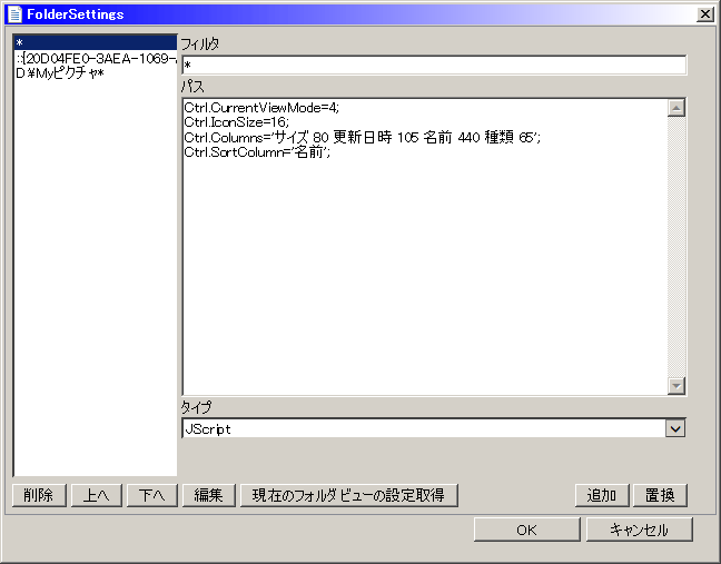・フォルダ設定(フォルダの表示設定を覚える、とは別物。)基本的には、「現在のフォルダビューの設定取得」をすれば楽。 フィルタ「*」は正規表現のワイルドカードで、「すべて同じ表示設定にする」ことが出来る。正規表現の説明は省く。 画像上の「D:\Myピクチャ*」の「*」は、いわゆる「D:\Myピクチャ以下をすべて同じ表示設定にする」設定。※「D:\Myピクチャ\*」だと「D:\Myピクチャ」は設定されない。 ・名前でソートする場合は→ Ctrl.SortColumn='名前'; ・更新日時でマイナスソート、上が最新で下が古い→ Ctrl.SortColumn='-更新日時';