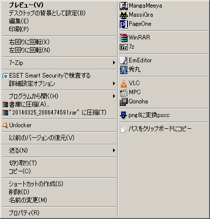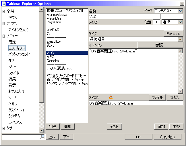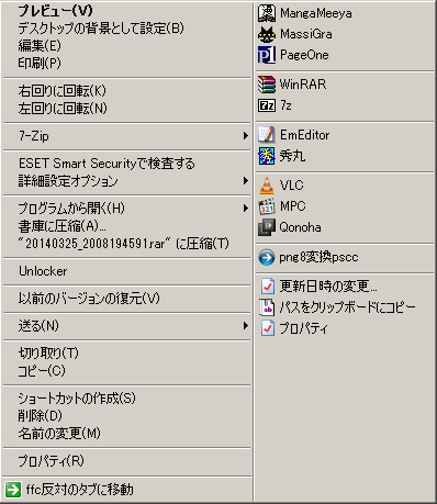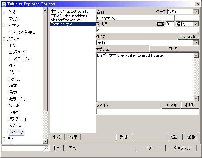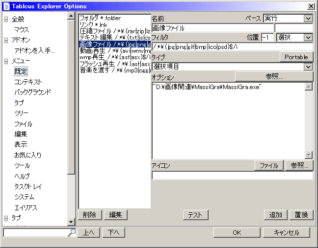 XFで使っていた人なら説明不要な感じ。メニューバーからツール→オプション、オプションウィンドウのメニュー→既定が独自関連付け。 フィルタ:「/.*\.(jpg|png|gif|bmp|ico|psd)$/i」は「.*」がすべての文字で「\.」が「.」自体をエスケープしたもの。「(~|~)」は拡張子。「$」は文末。「i」は大文字小文字を区別しない修飾子。 タイプ:「選択項目」は、選択項目をオプションで記述したファイルに渡して実行、という意味。 オプション:いろいろ記述する。ファイルを指定する場合、スペースがなくても""で囲ったほうがいいかも。バージョンによるのかもしれないけど、""で囲わないと不具合が出たことがある。 エイリアスのカスタマイズ