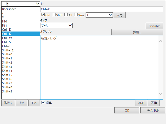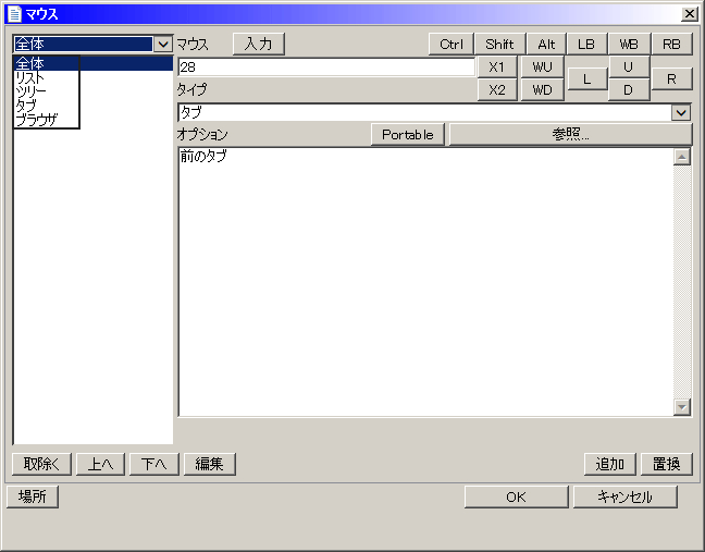 リスト →ファイルが羅列されているウィンドウ内 ツリー →ツリー内(初期だと表示無し) タブ →タブの文字が書かれている場所 ブラウザ →(たぶん)インターネットブラウザ ・設定を変更するには。 変更したいものをダブルクリックします。 入力欄の「マウス」はジェスチャの動きを入力します。 「タイプ」は何を動かすかを選びます(開く→ファイルなど、実行→exe起動など)。 「オプション」は何を開くか、実行するか、を記述します。基本は「参照」から選択できるのでそこから選択してください。 ・設定を完了させるには。 ウィンドウ右下の、「追加(新規)」か「置換(上書き)」を押します。 2015/08/03追記、>>4ボタン5ボタンで戻る進むを設定したい。 設定で左上のドロップダウンから一覧を選択し、マウス項目に4or5を直接入力、タイプを「タブ」、オプションを参照から「戻る」か「進む」に設定し追加ボタンを押してください。 キーボードショートカットの設定2015-12-16追加
