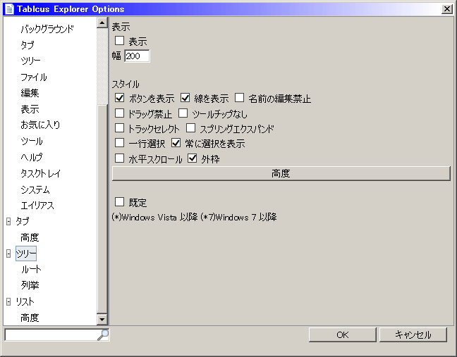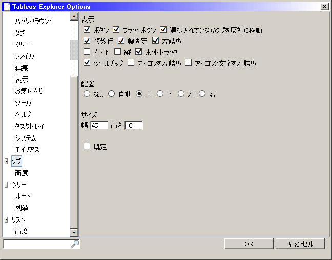 画像の初期状態から変更点は「ボタン、フラットボタン(両方チェック入れないとフラットにならない)」「幅固定とサイズ」※変更を適応する場合、既定にチェックを入れてからOKを押さないと全ての分割ウィンドウに適応されない。 タブ幅を固定しないとフォルダの名前が長いとタブ列が2列になったりするので、見栄えが悪くなったりまさに幅を取ったりする。 アドレスバーの設定