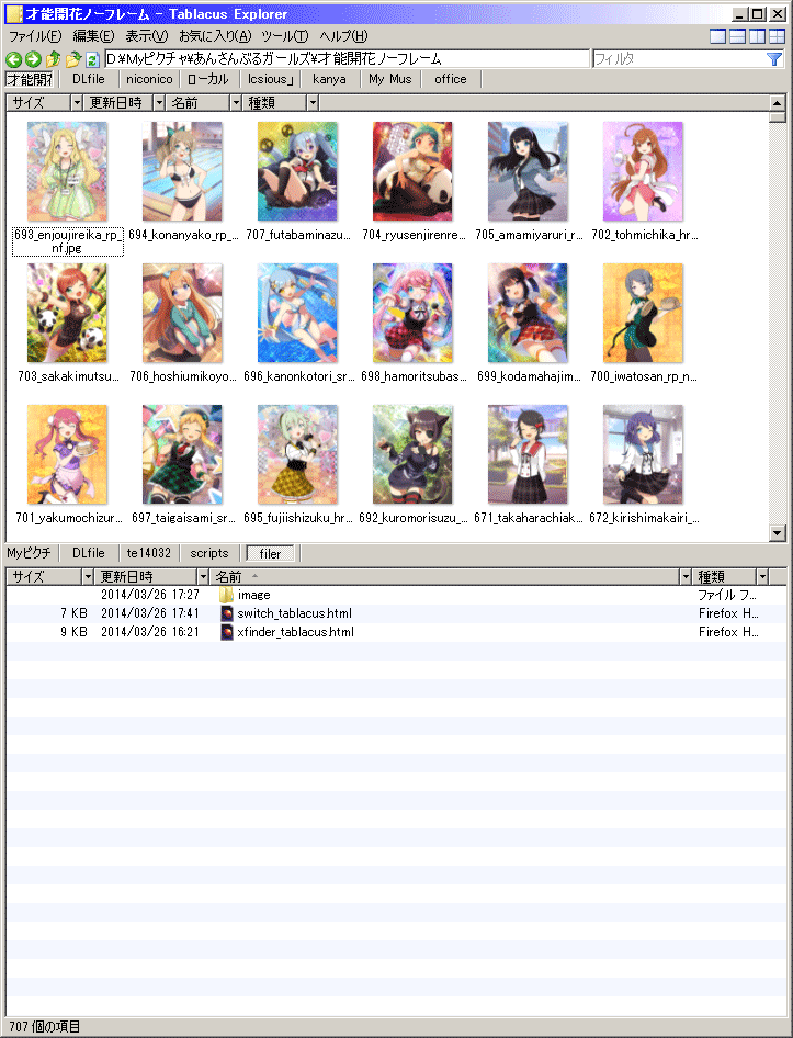 ※150304の時点の標準搭載アドオンいつの間にか標準から消えてたりするので、確認用。 ・画面が分割されてない 2014/12/30追記、いつの間にか分割アドオンが標準搭載されてない状態でした。 「ツール→アドオン→アドオンを入手」から分割をダウンロードしてOKを押したら右上に分割ボタンが出るので、それをクリックしてください。 ・カラムのサイズを全部一定にしたい 初期状態だとフォルダ単位で表示設定を1000フォルダ覚えます。設定でほぼ無限に増やせます。 フォルダ単位ではなく、一括で設定したい場合はメニューバーの「ツール→アドオン→アドオンを入手」からフォルダ設定をダウンロードし、アドオンの設定を参照してください。 ・タブを増やしたい 最初に開かれているタブを右クリックし「新しいタブ」をクリックで新しいタブを開けます。 リストに表示されているフォルダを右クリックで「新しいタブで開く(フォーカスを新しいタブへ移す)」か「バックグラウンドで開く(フォーカスを移さない)」。 もしくはリスト内でマウスジェスチャの「右クリックダウン」で開けます。 それ以外は初期設定だとたぶんありません。 ・レイアウトの変更2015-12-21追加 いわゆる分割画面のスタイルを変更します。 メニューバーの「ツール→レイアウトの読み込み」から<ファイル名>.xmlを選択してください。 自分の好きなようにカスタマイズしたい場合、xml(html)をほんの少し理解出来れば出来ます。